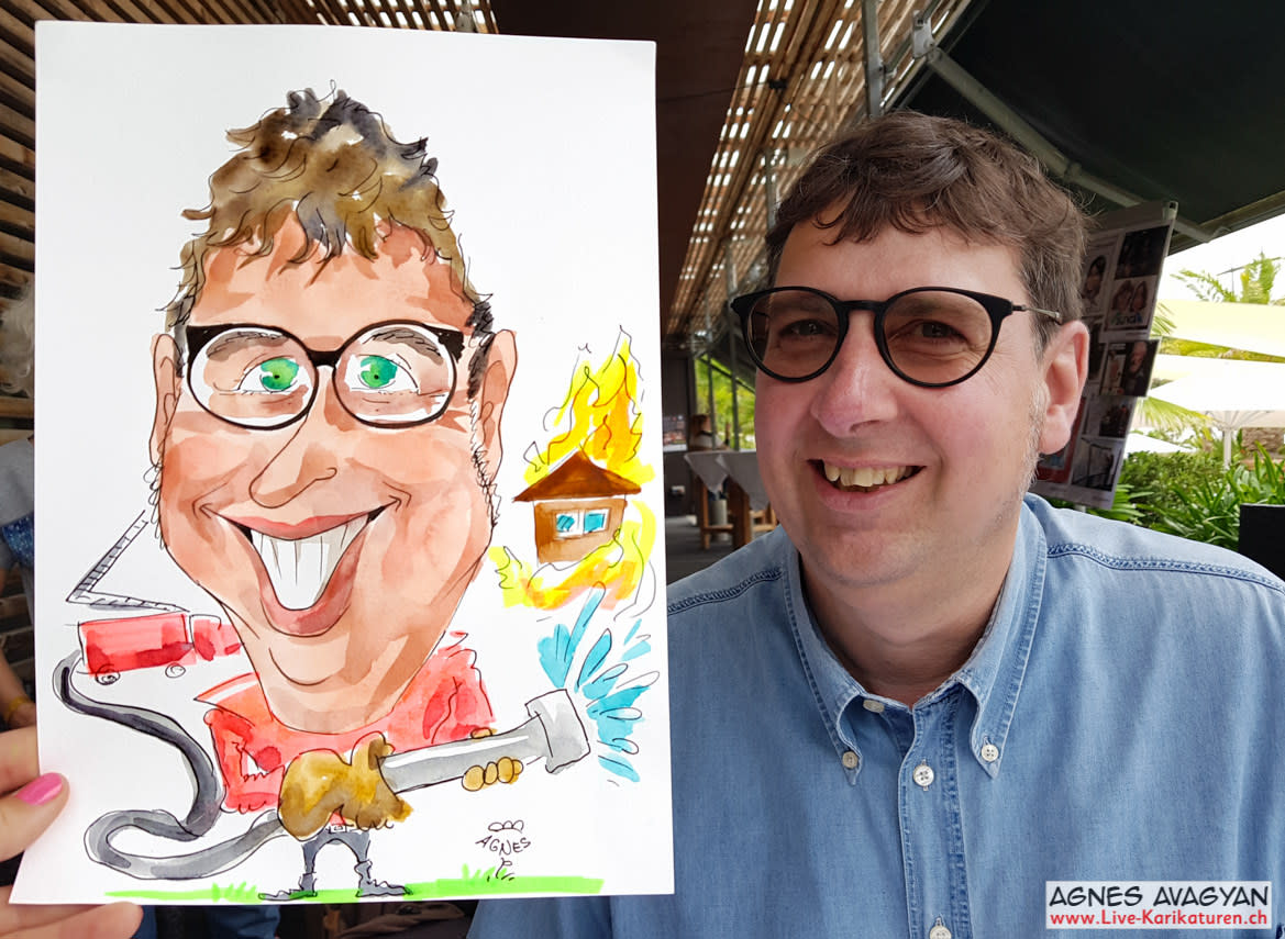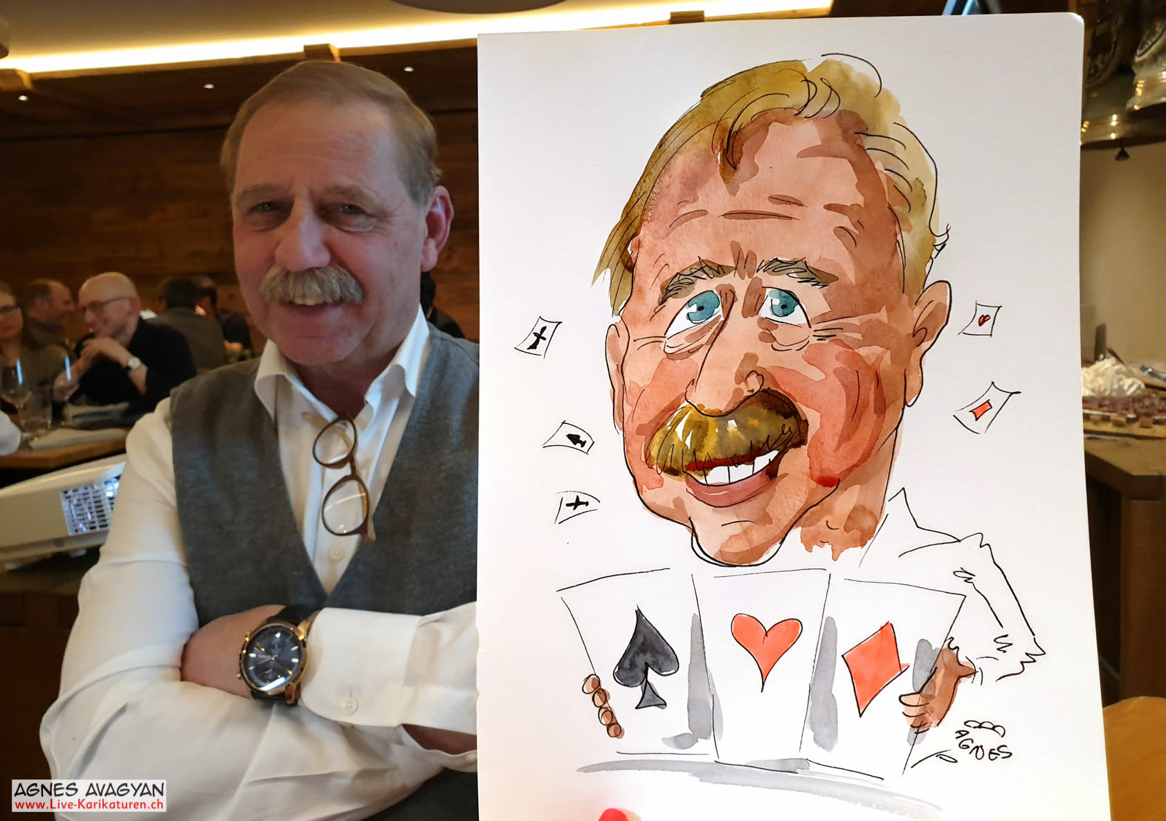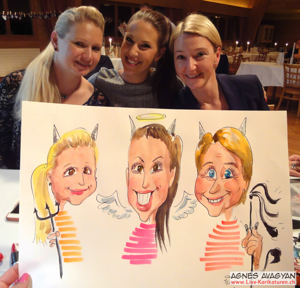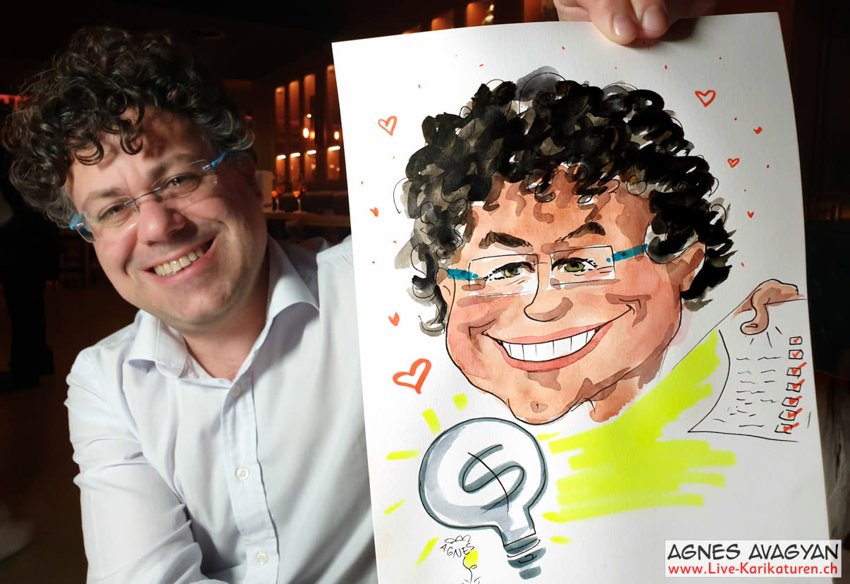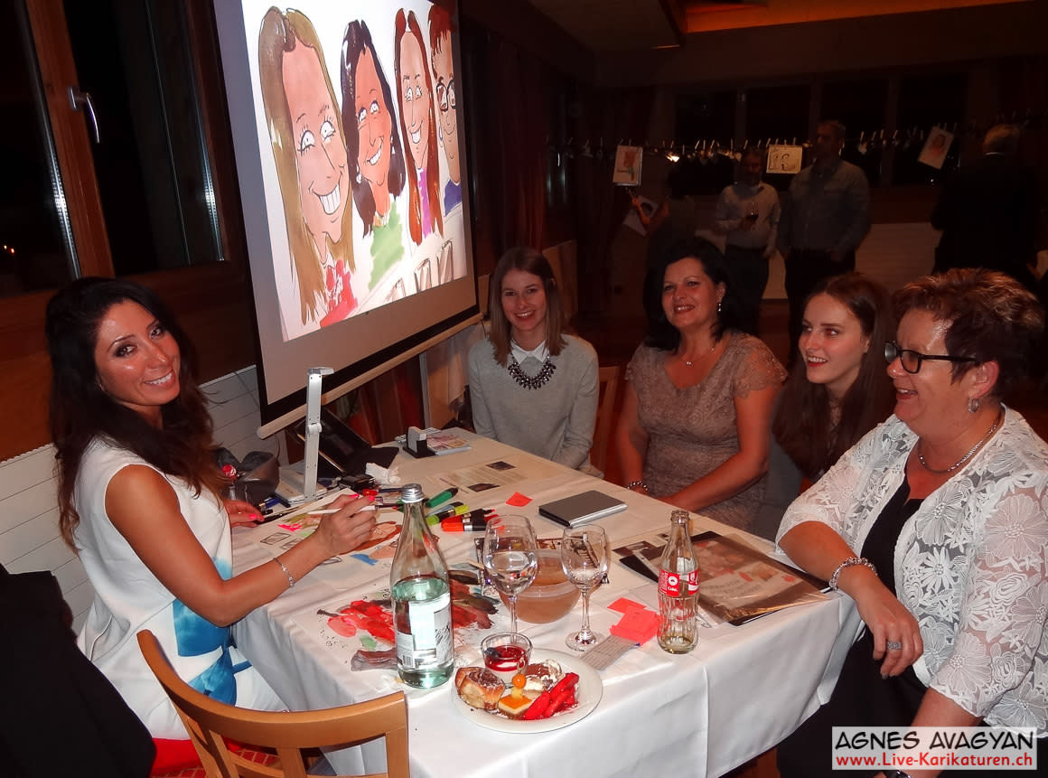Agnes zeichnet seit über einem Jahrzehnt schweizweit an unzähligen Firmenevents, Weihnachtsessen, Messeevents, Jubiläumsfeiern, Geburtstagsparties, Hochzeitsfeiern und Firmensitzungen. Mit ihrer Visualizer-Kamera kann der Zeichnungsprozess mit einem Beamer live auf Leinwand übertragen werden. Während einem Essen kann die Künstlerin ab Foto zeichnen. Die Porträtzeichnungen stellen die Gäste in den Mittelpunkt und bringen die Menschen miteinander ins Gespräch. Auch wenn nicht sämtliche Leute gezeichnet werden können, freuen sich alle, dabei zuschauen zu können. Karikaturen eignen sich hervorragend, um Gruppenmitglieder originell in Szene zu setzen, z.B. mit einem Hobby oder einem Motto. Diese dezente, geräuschlose Form der Unterhaltung ist ein Hit und eine Bildschirmübertragung lohnt sich auch für kleine Gruppen. Die Gäste können sich ungestört unterhalten.