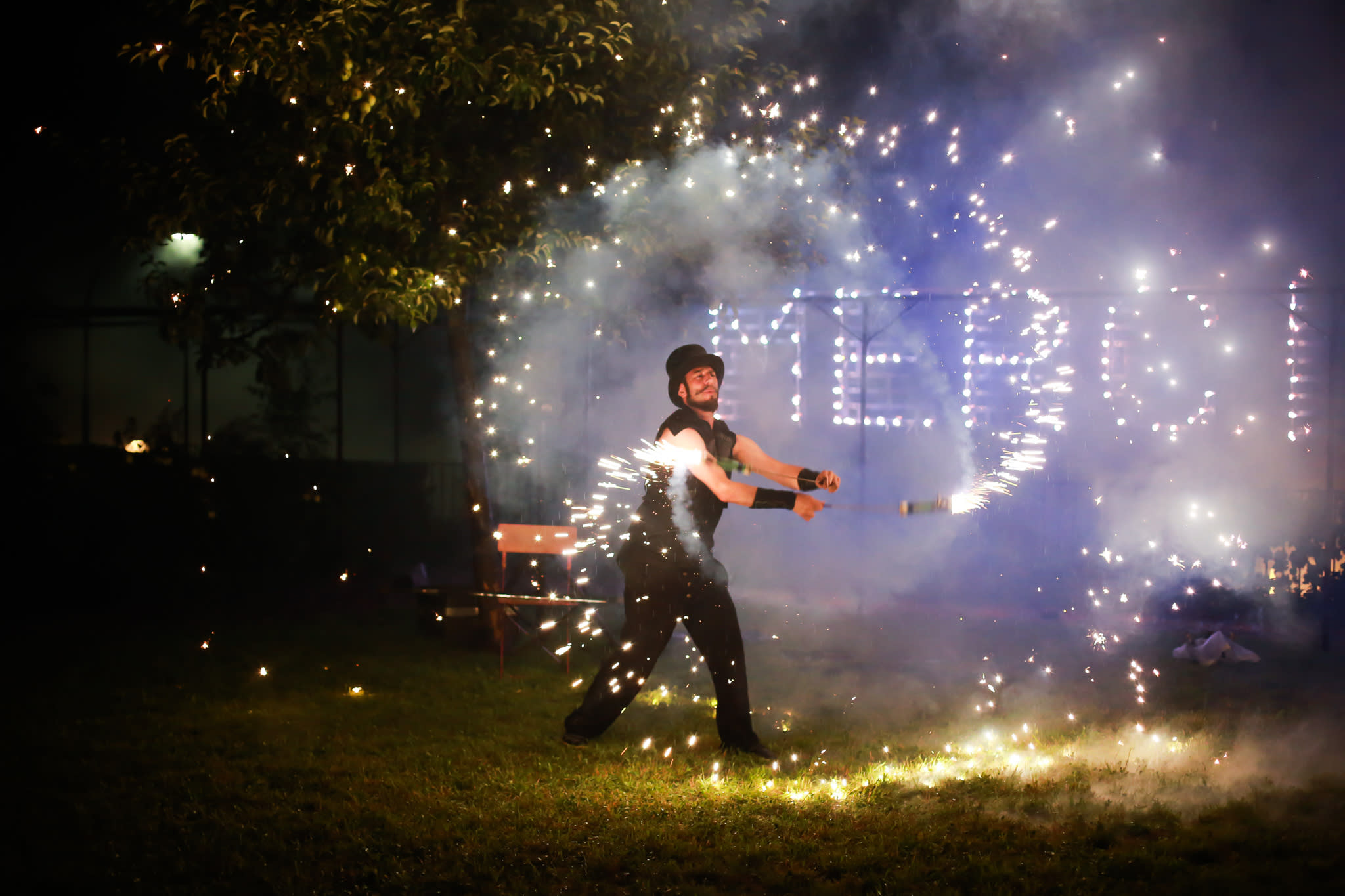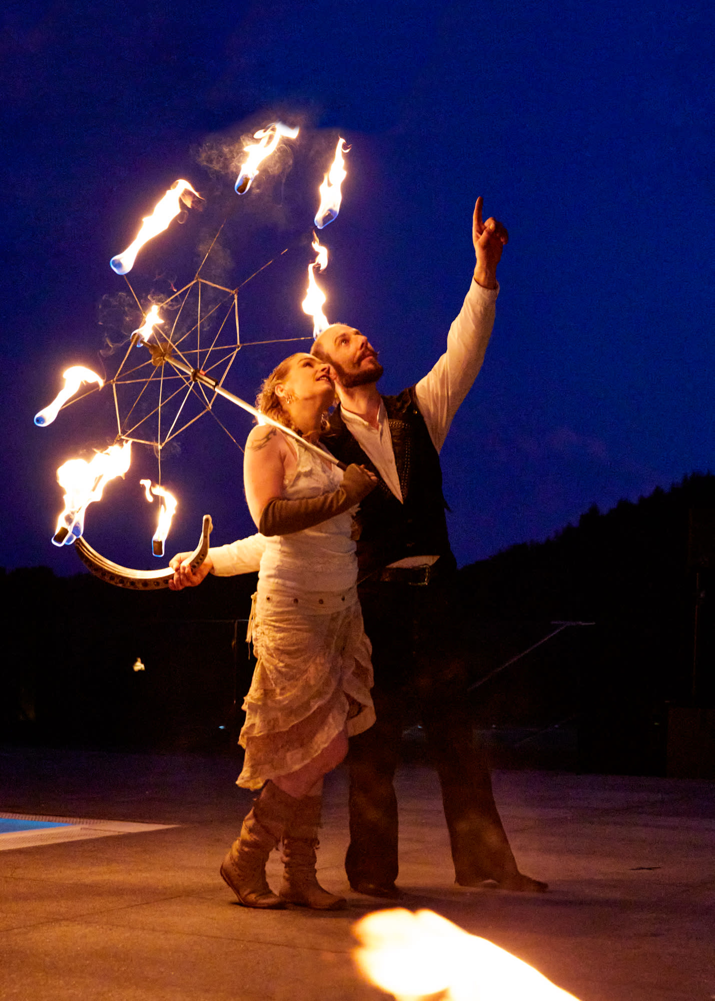 Spielfreude und kurzweiliger Dramaturgie berühren wir seit Jahren unser Publikum. Ergänzt wird unser Angebot durch Feuerherzen, Feuerschriften, Lichteffekte und Pyrotechnik. Gerne gehen wir auch auf Ihre speziellen Wünsche ein.