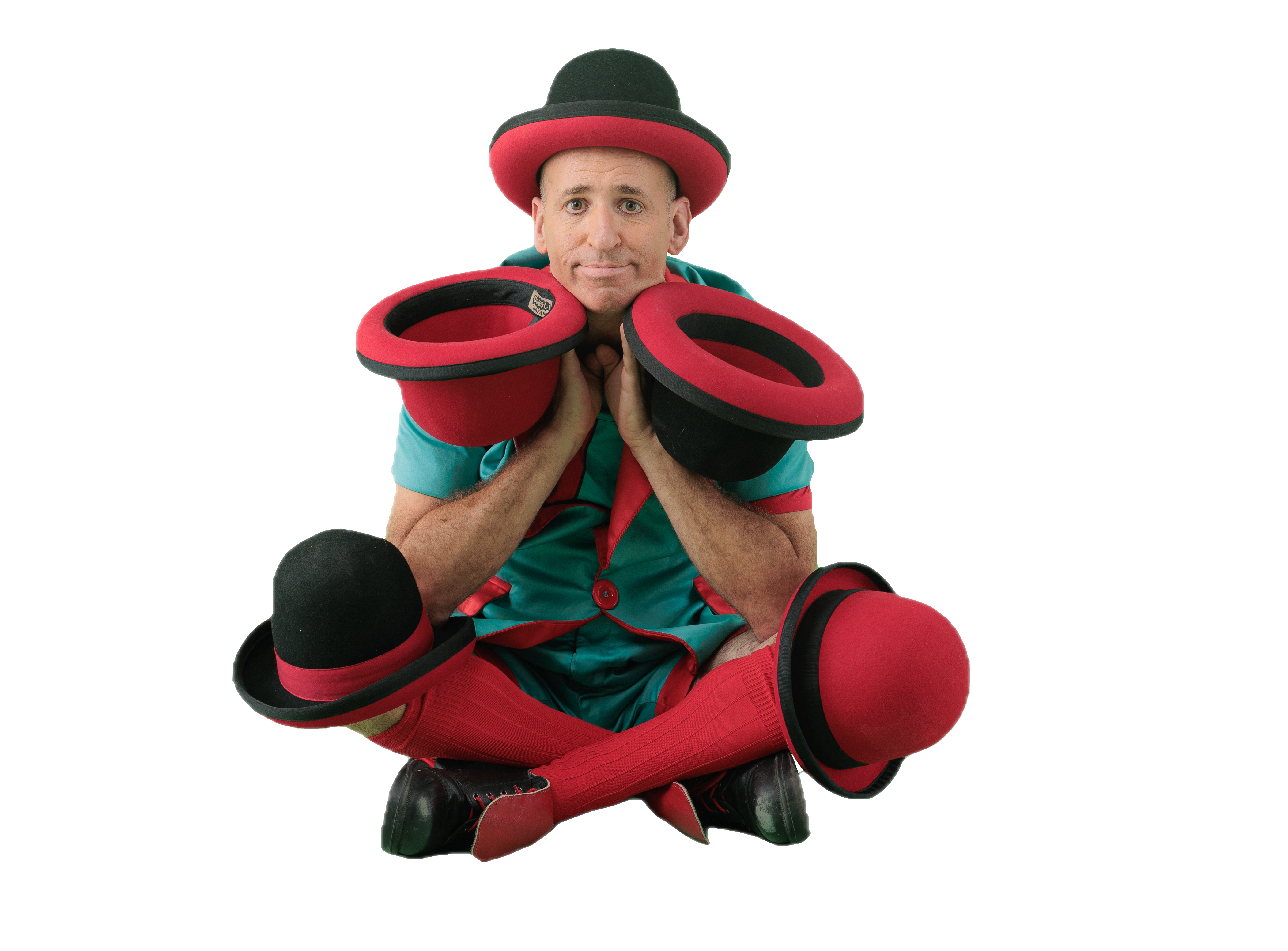 Allein auf der Bühne bringt er eine originelle Show voller Höhe, Hüte und herrlichem Chaos.