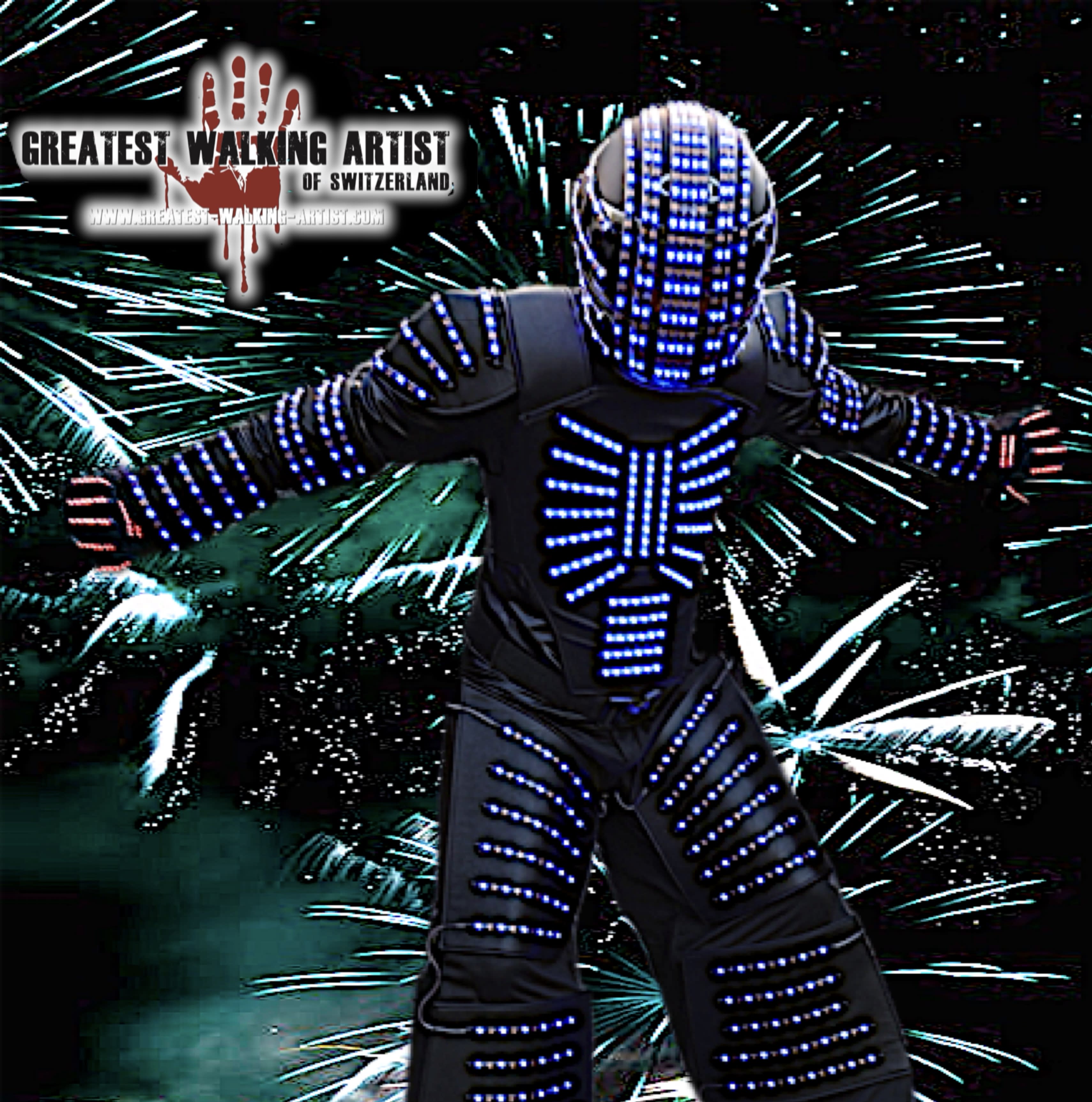 hier bieten wir eine professionelle LED Roboter Show an für Ihre Veranstaltung oder Party. Der Robot ist auf Stelzen (2.20 Meter hoch) hat Laserhandschuhe und einen Flammenwerfer. Ob auf einer Party Hochzeit oder in einem Club, der Robot ist das Highlight auf ihrer Veranstaltung. Die Show beinhaltet 2 x 25 Minuten die frei wählbar sind. Wir benötigen bei Buchungen eine Garderobe sowie einen Parkplatz für unseren Tour Bus