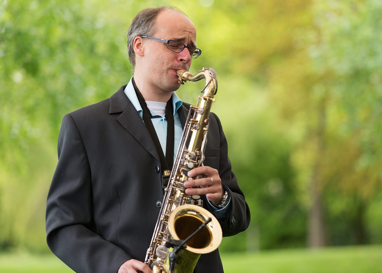 Seit mehreren Jahren bin ich im ständigen Einsatz als allein auftretender Live-Saxophonist, begleitet von professionell arrangierten und eingespielten Play-Alongs. Das Programm ist sehr umfangreich und wird ständig erweitert. Wegen der großen stilistischen Bandbreite passe ich zu allen Firmenfeiern, Hochzeiten, Ausstellungseröffnungen, Empfängen und Präsentationen. Durch den Einsatz verschiedener Saxophone und gelegentlich auch der Flöte entsteht eine interessante Mischung unterschiedlicher Sounds. Als allein spielender Saxophonist habe ich für meine Auftraggeber einige Vorteile: der Platzbedarf ist gering, Terminabsprachen sind nur mit mir nötig und Budgets werden nicht überstrapaziert. Zudem kommt der Klang des Saxophons beim Publikum immer sehr gut an und erzeugt zufrieden lächelnde Gesichter – das optimale Instrument für Ihre Gäste!