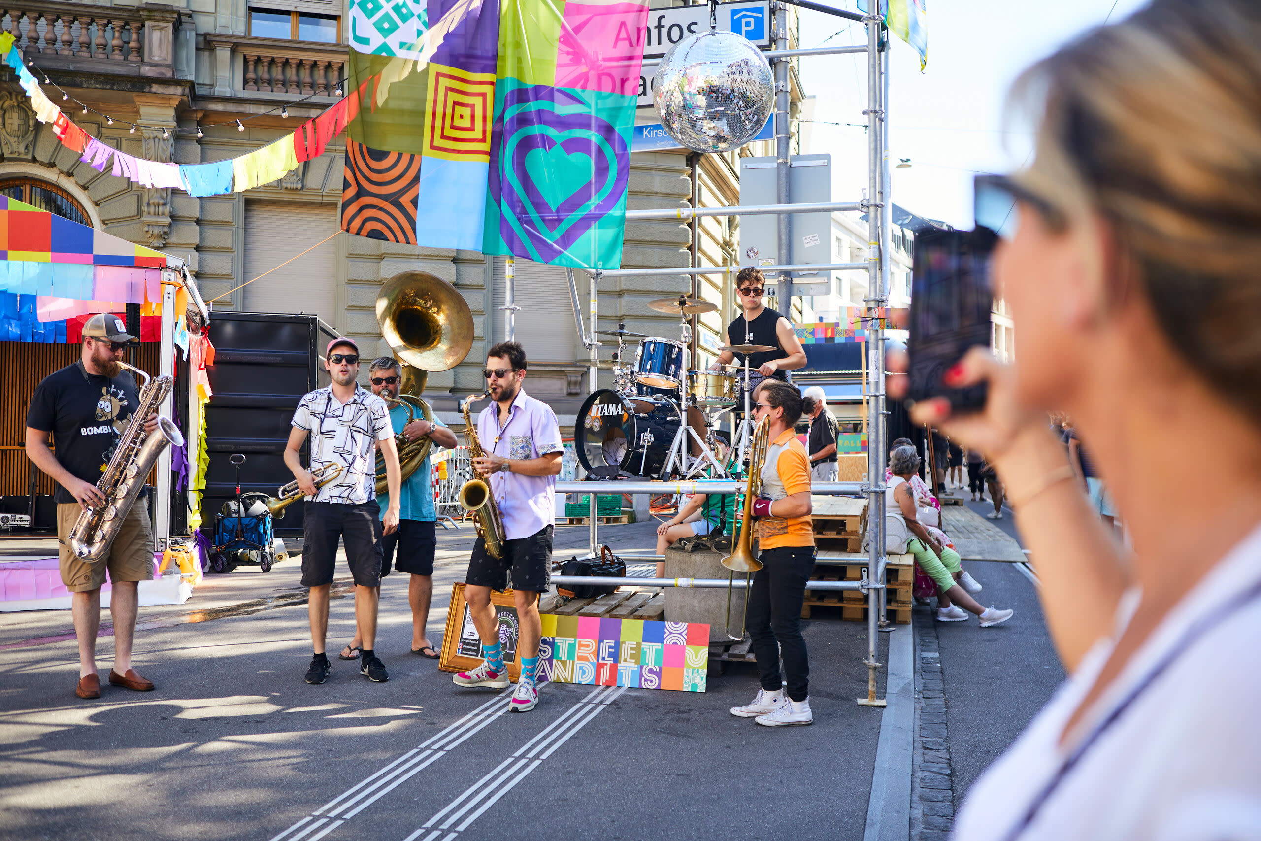 Wir können sehr gut komplett unverstärkt spielen, brauchen weder Bühne noch Anlage und sind mobil. Draussen, drinnen, an mehreren Standorten, Strassenmusik, ausgelassene Partystimmung und eher konzertant, alles geht und innerhalb von Minuten sind wir spielbereit und nach dem Auftritt auch wieder weg.