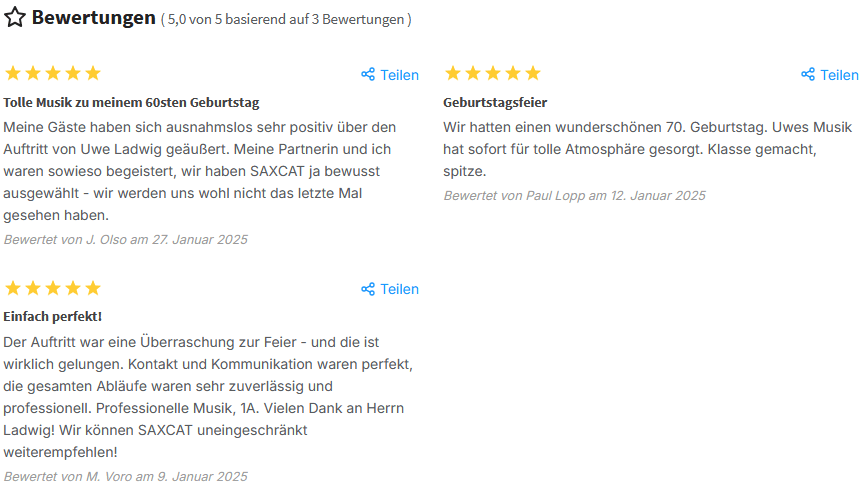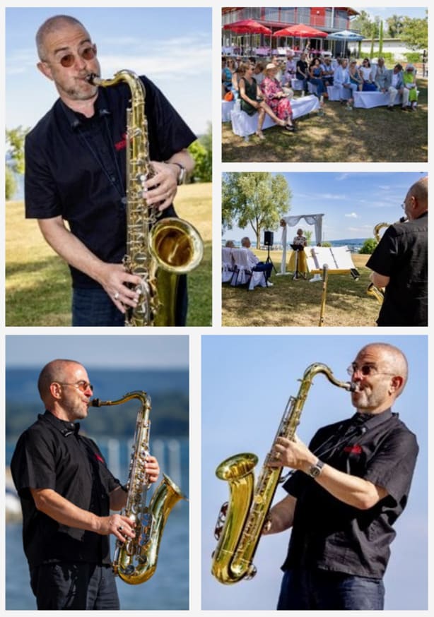 100% feinste Saxofonmusik - von jazzigem Lounge-Sound bis zu tanzbarem Pop & Soul. Platzbedarf weniger als 2x2 m. Mit Top-Sound, aber vollkommen unabhängig von Fremdstrom - ideal auf Schiffen, bei Gartenparties, vor dem Standesamt etc..