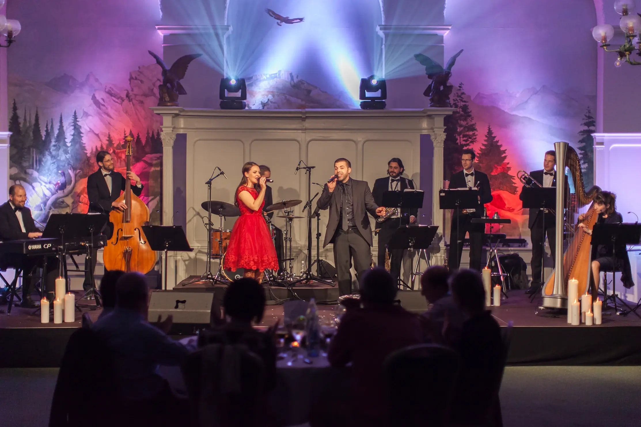 “The Sparkling Diamonds“, die neunköpfige Swing-Band, welche Sie in einer einzigartigen Kombination aus Stimmen, Bläsern und Konzertharfe, mit den schönsten Songs verzaubert.